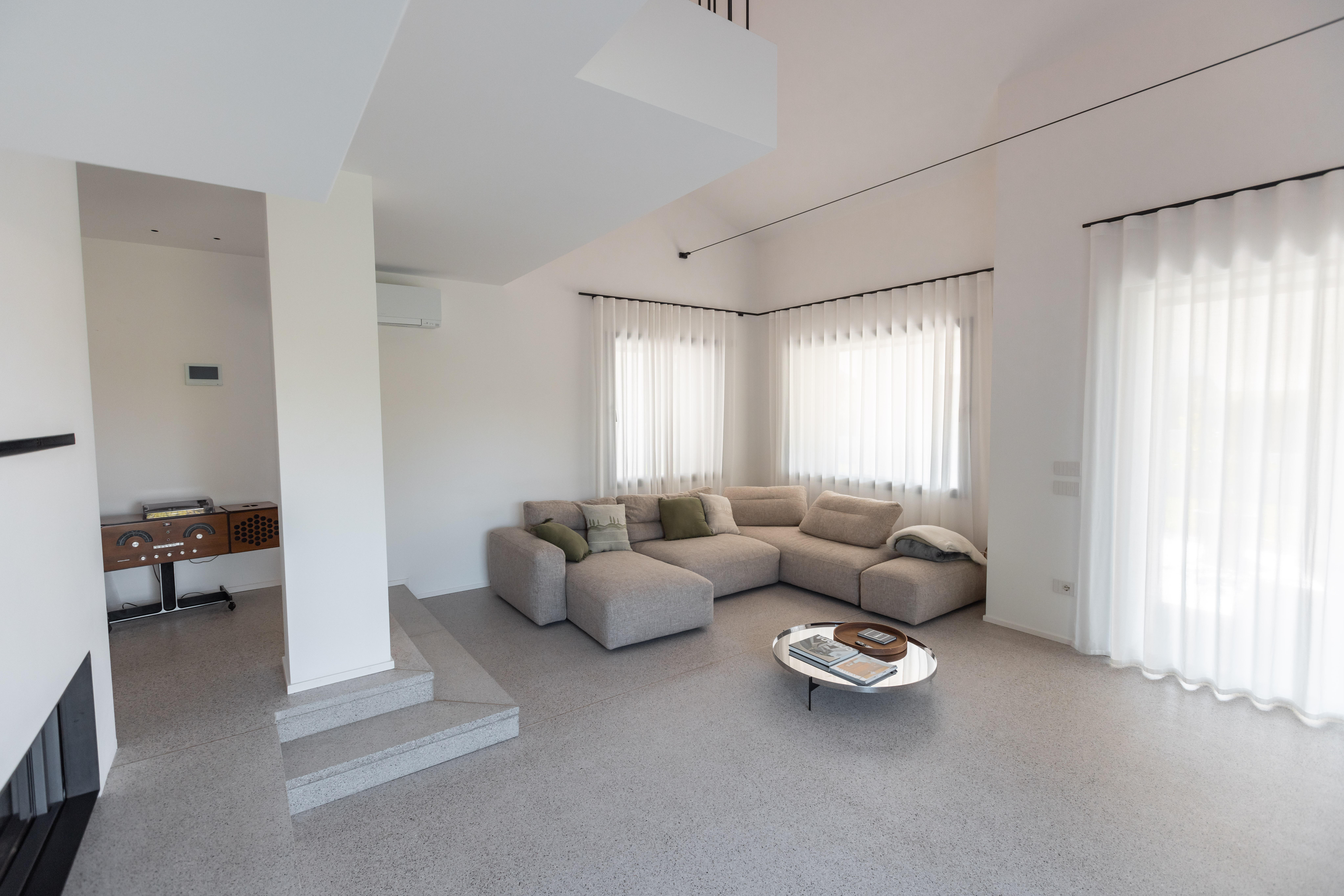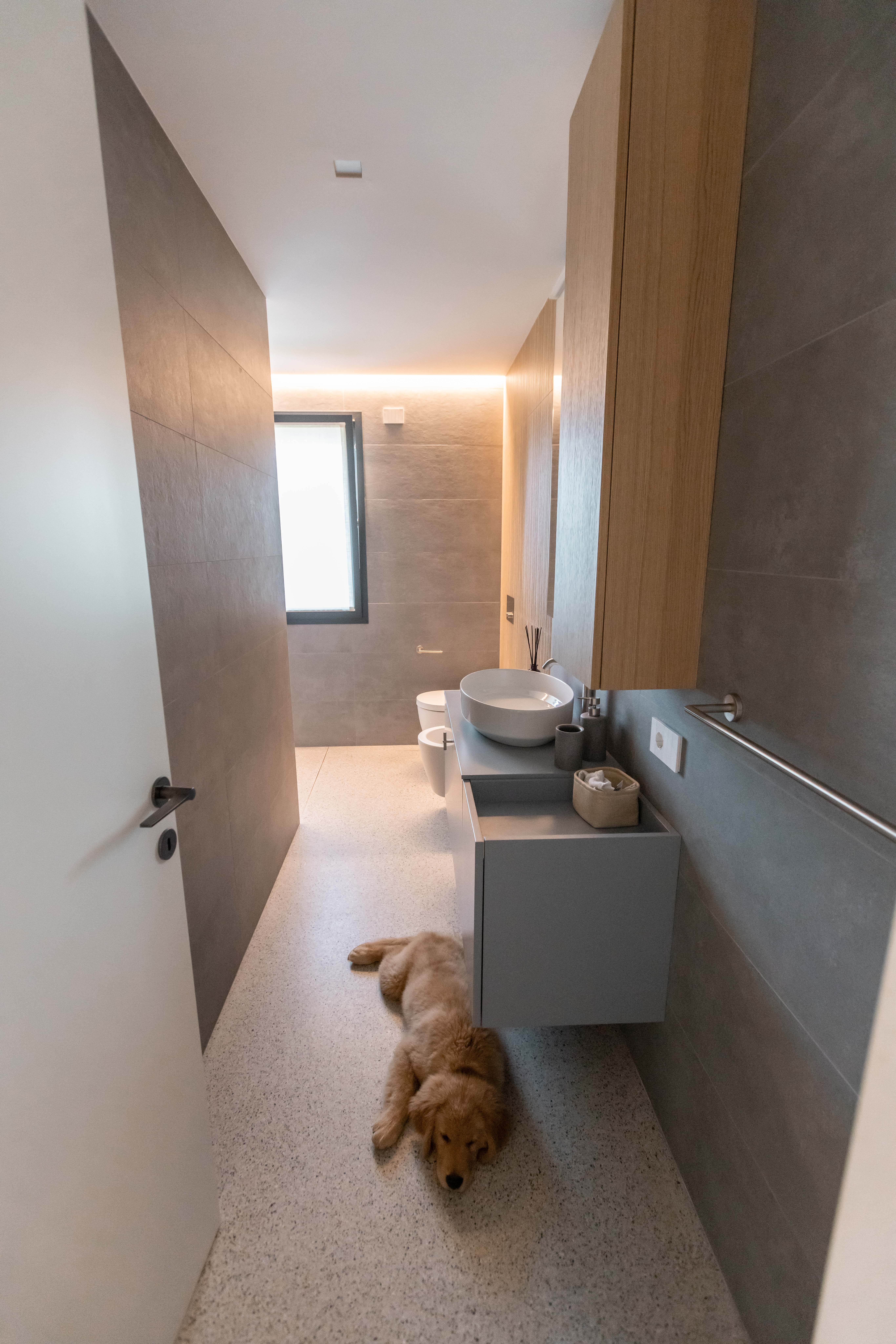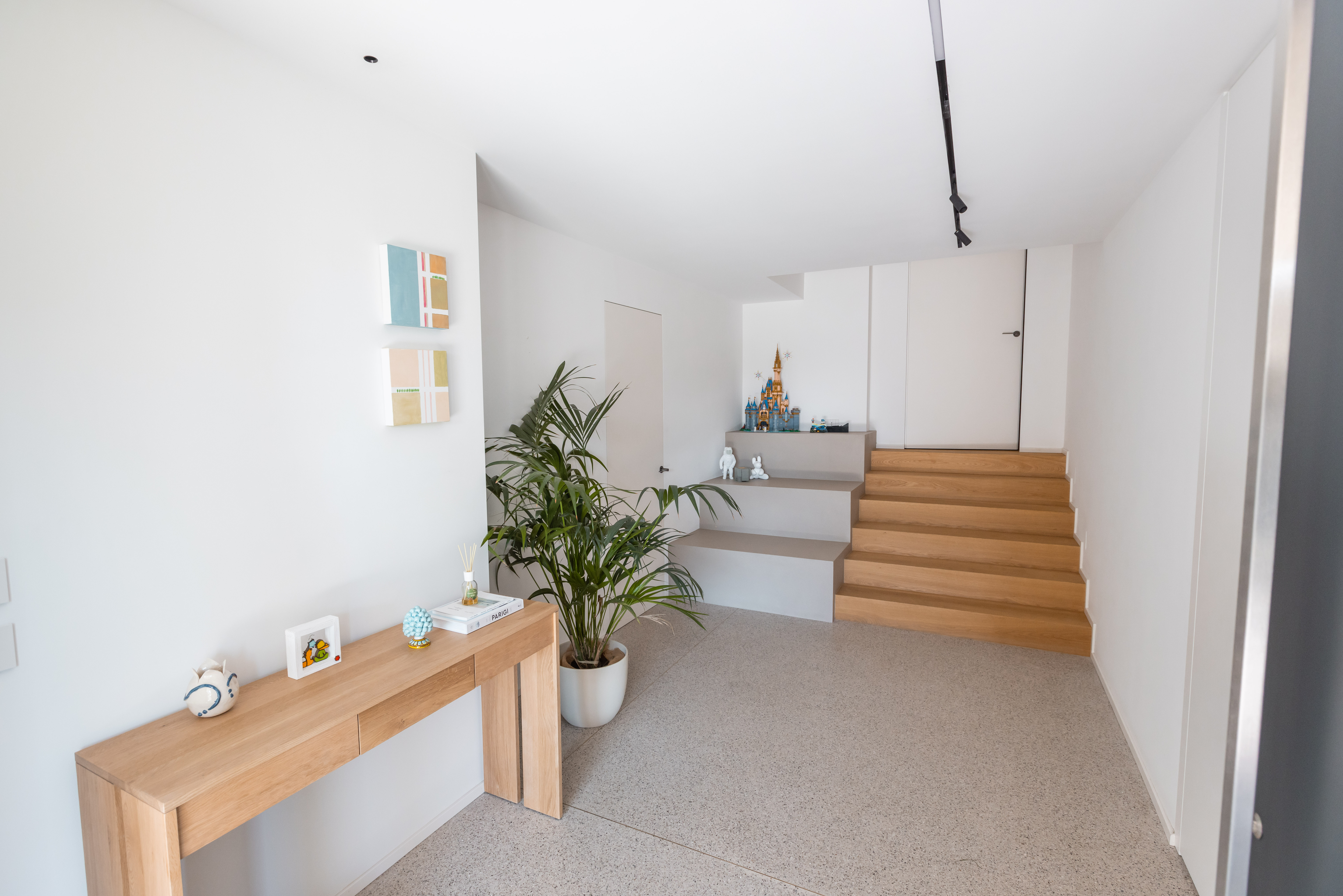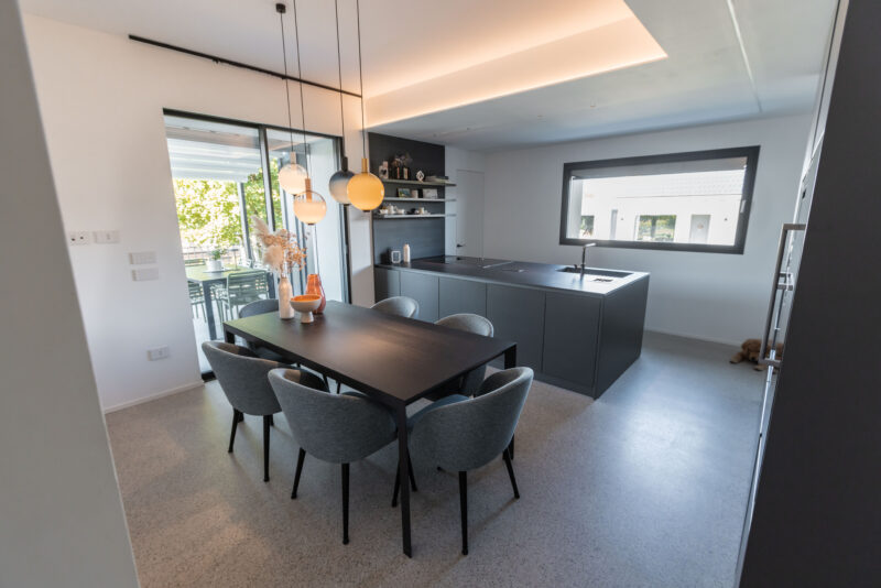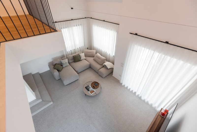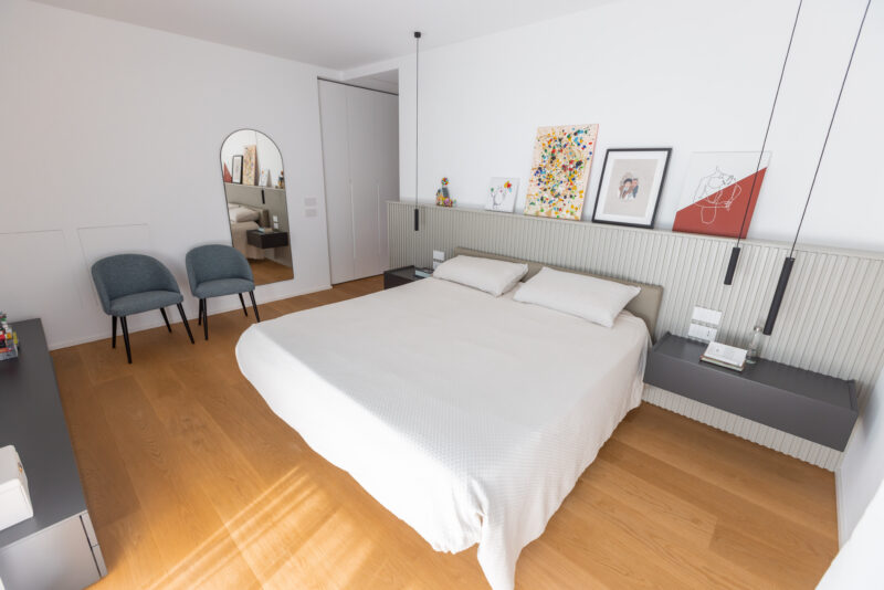 Le finiture selezionate — legno naturale nella zona notte e microcemento effetto veneziana nella zona giorno — definiscono uno stile minimal ed elegante. Ogni dettaglio, dagli arredi allo studio illuminotecnico, è stato progettato per valorizzare gli ambienti e dare nuova armonia alla casa.